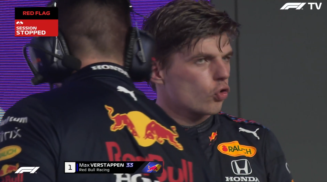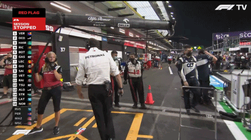 第一次红旗之后,再次起跑。汉密尔顿从第二名超过维斯塔潘,但维斯塔潘跑出赛道后切弯重新超回来!