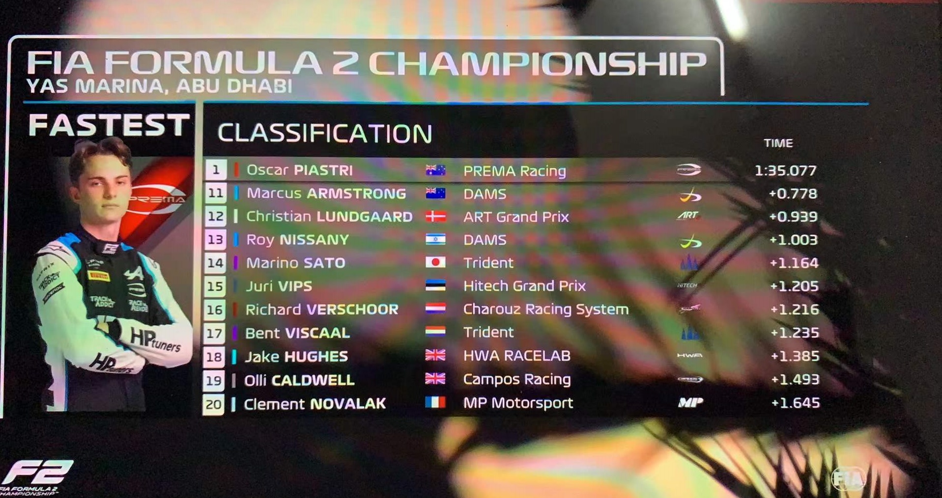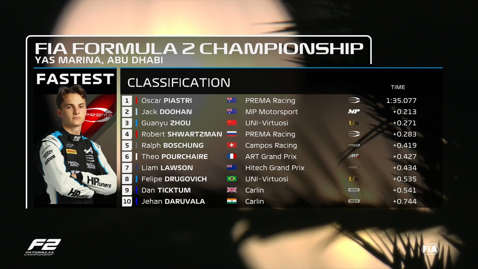 F2最后一站阿布扎比排位赛结束。周冠宇落后0.2秒,排名第三。
