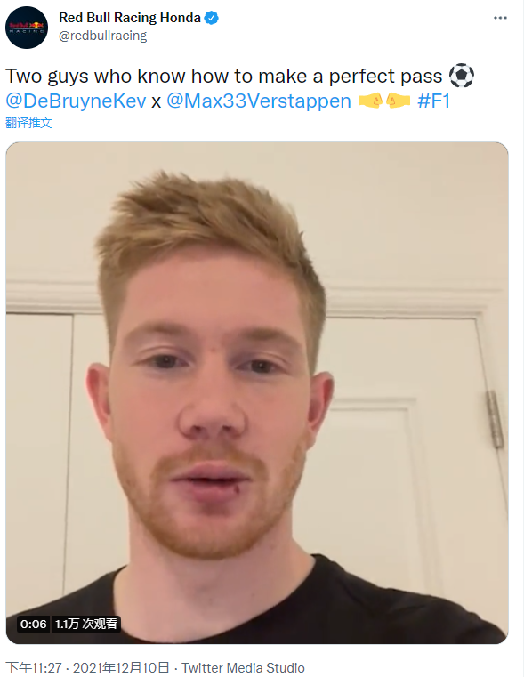 红牛车队社交媒体释出曼城中场巨星德布劳内的助威视频。视频里德布劳内说:Hi,维斯塔潘。我是德布劳内。我非常享受你的比赛,你比汉密尔顿更强。希望你能在阿布扎比获得冠军,享受车手总冠军的荣耀。
