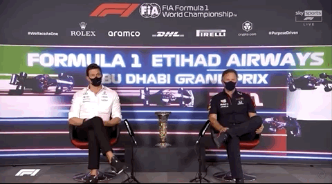F1阿布扎比站周五的车队高层发布会当中,托托·沃尔夫和霍纳共同出席。而车队总冠军奖杯就被放置在两人之间。