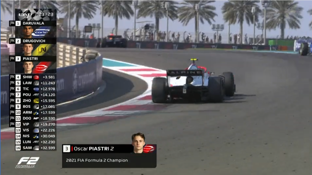最终,达鲁瓦拉守住分站冠军,皮亚斯特里夺得第三,赢得了本赛季的F2年度车手总冠军。