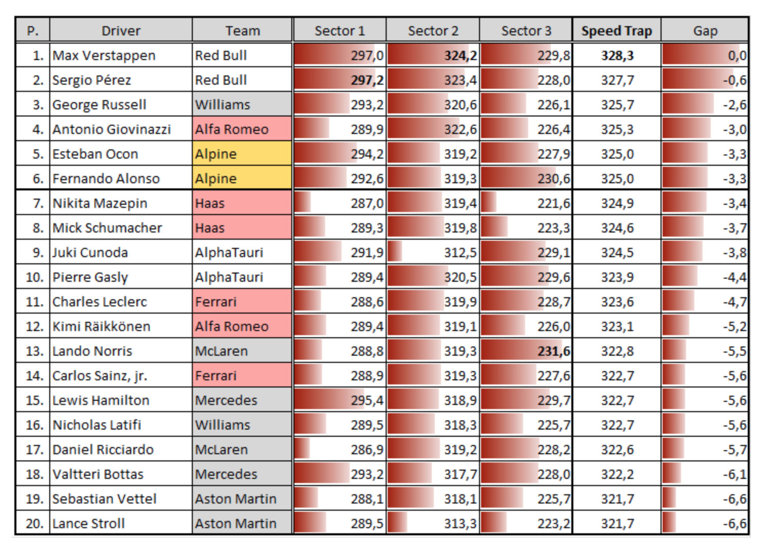 虽然取得杆位不能忽略红牛两位车手配合的作用,但奔驰车队在如此重要的比赛中取得差强人意的表现,不得不让人怀疑是否有其他原因。而在刚刚公布的排位赛尾速排行中,或许能找到一些端倪。