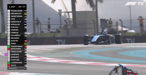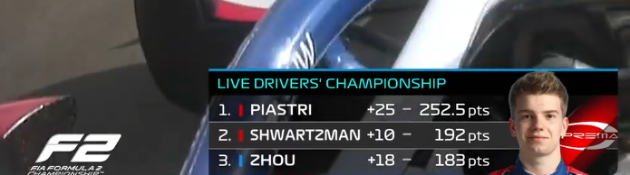 在最后一圈,德鲁戈维奇超到第三名!周冠宇的竞争对手舒瓦茨曼落到第五。