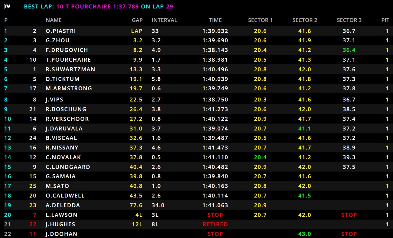 第10圈,周冠宇在强制进站之后,恰好压在了施瓦茨曼的前方,保住了进站前与对手的优势。但随后几圈一直被舒瓦茨曼攻击,差距都在0.5秒左右。