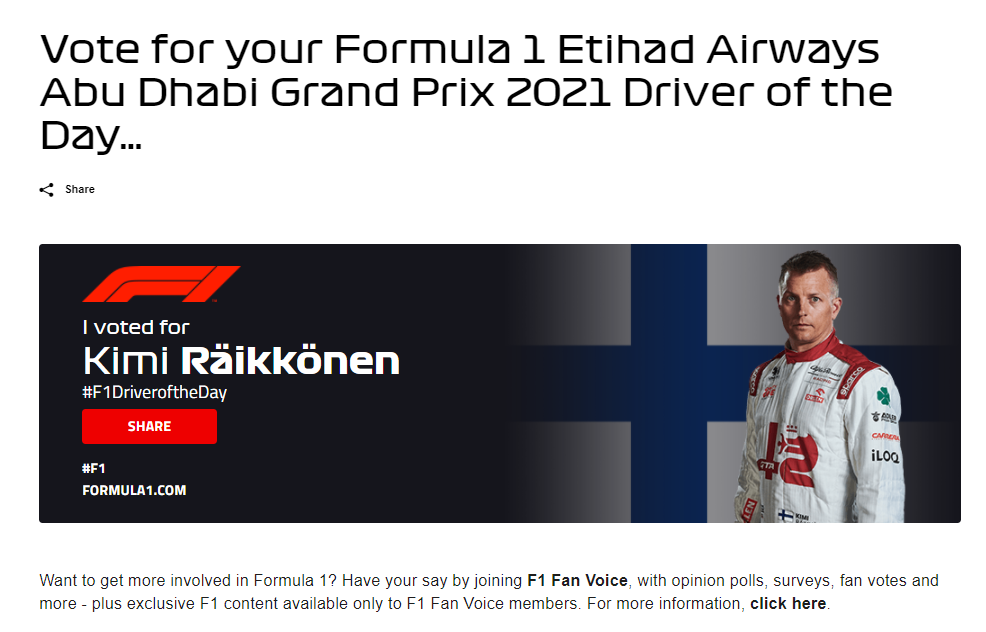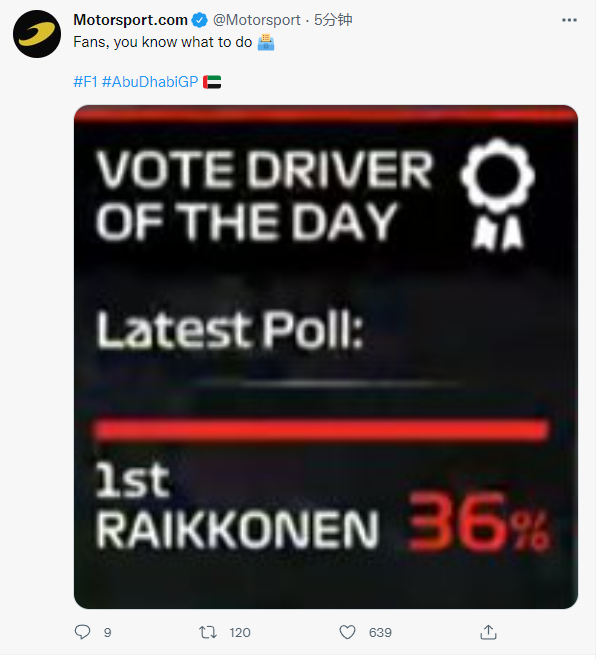 F12021赛季最终落下帷幕,网友将本场比赛最佳车手投给了赛后即将退役的Kimi。