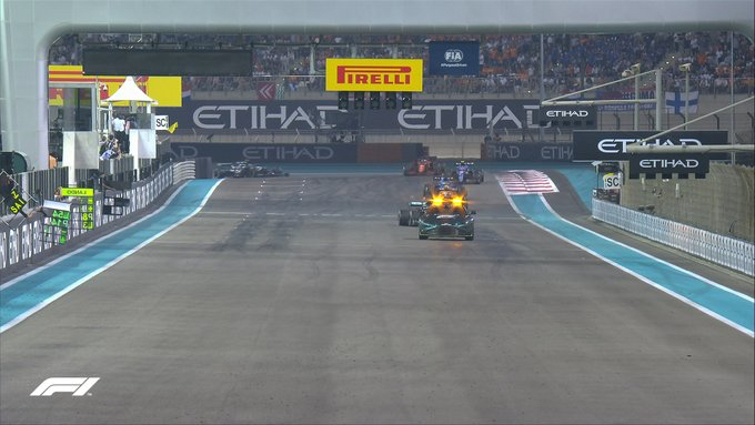 拉蒂菲在53圈撞墙导致赛会出动安全车后,赛事总监马西曾强调“被套圈车辆禁止超车”,似乎预示着维斯塔潘夺冠的希望已经破灭。然而,情况在倒数第二圈急转直下。马西认为赛道条件足够安全,允许夹在汉密尔顿和维斯塔潘之间的五辆慢车超车解套,并在最后一圈恢复比赛。但正是这种情况,使领跑了大半程比赛的奔驰最终遗憾落败。
