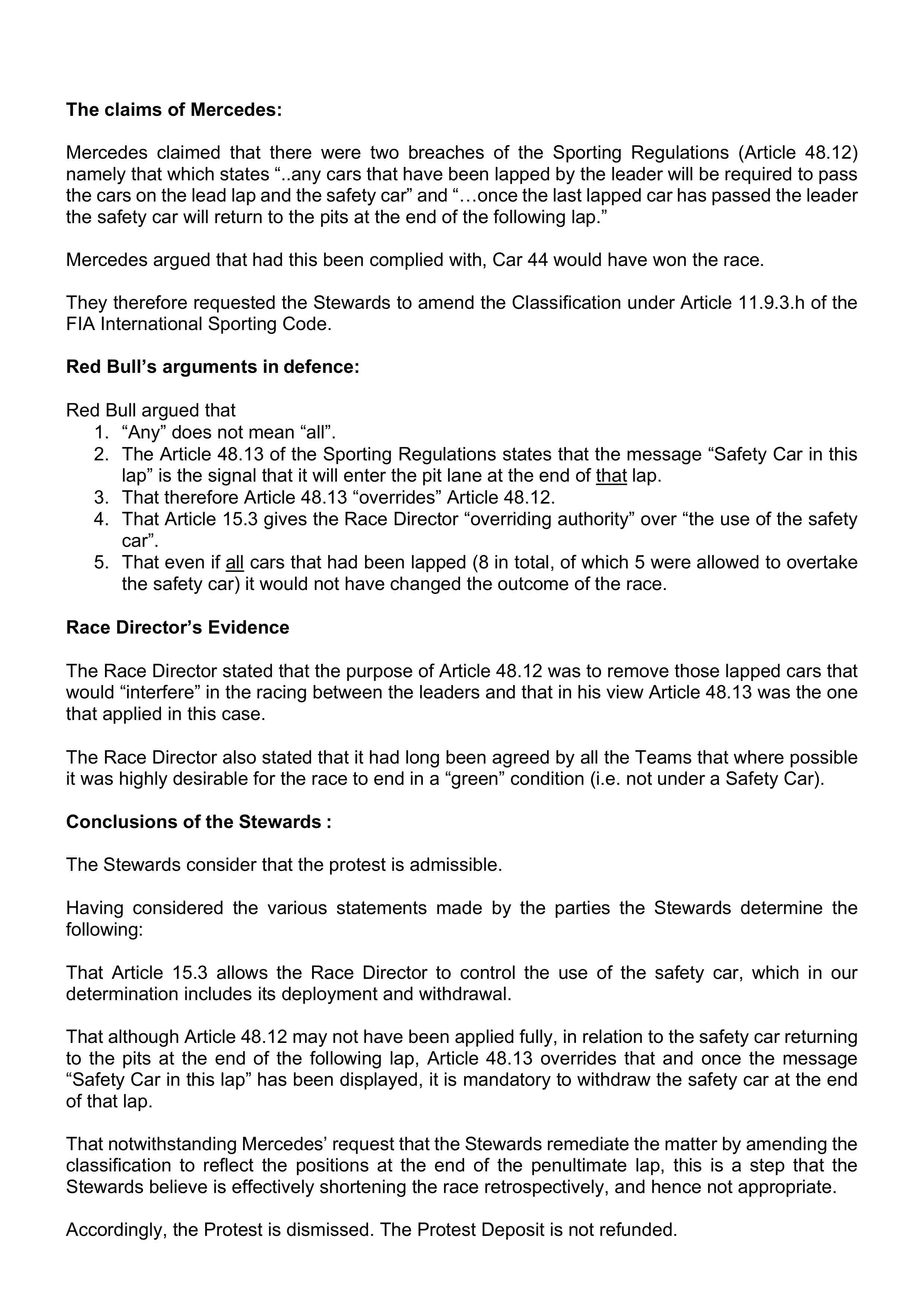 第一项申诉是关于维斯塔潘在安全车下超车,赛事干事认为虽然维斯塔潘在某一瞬间有轻微超过汉密尔顿,但是两台赛车都在不停的加速和减速,且在安全车线时维斯塔潘不在汉密尔顿身前。所以驳回了这一决定