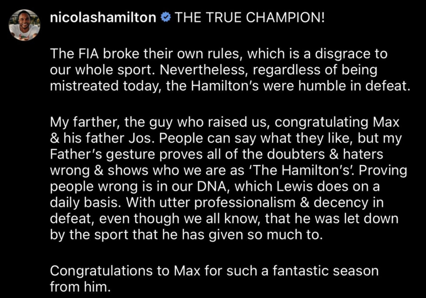 “我的父亲祝贺了维斯塔潘和他的父亲乔斯。人们可以尽管发表言论,但我父亲的表现证明了所有怀疑者和憎恶者是错误的,展现了我们是汉密尔顿家族。证明人们是错误的,印在了我们的 DNA里面。刘易斯每天都会这样做。 尽管我们都知道他对这项他付出如此多的运动感到失望,但他在被击败后仍然表现出了专业精神和体面。”