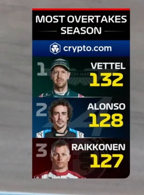 本赛季F1比赛已全部结束,根据官方统计数据显示,维特尔一共完成了132次超越,位列超车榜首位。排名第二和第三的阿隆索和莱科宁分别贡献了128和127次超车。