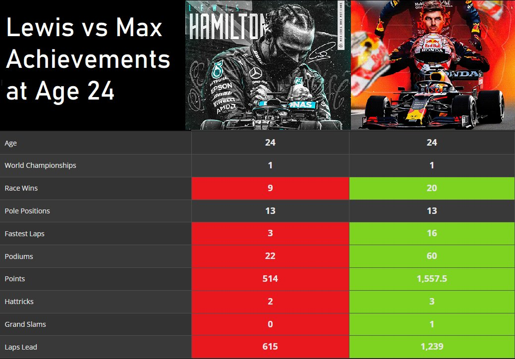 阿布扎比站后,维斯塔潘夺得人生第一个F1世界冠军,年仅24岁。推特上有网友将汉密尔顿和维斯塔潘在24岁取得的成就进行了对比。