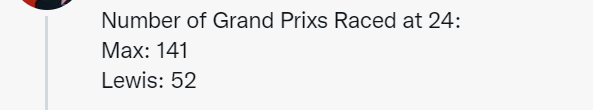 因为维斯塔潘进入F1较早,在24岁时,汉密尔顿只参加了一个F1赛季,共52场大奖赛,维斯塔潘却参加7个赛季,共141场大奖赛。并且,当时的积分制度也不同。