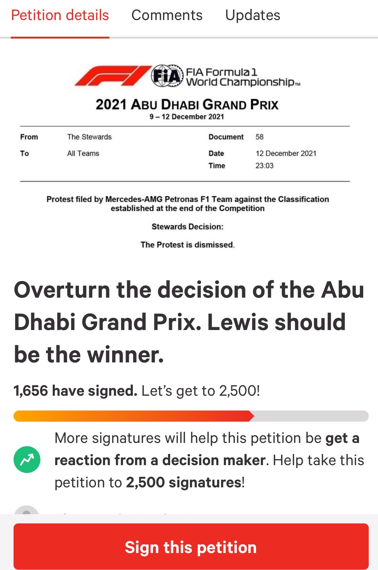 近日,有车迷便在这个平台上发起了请愿,希望F1的监管人员能够推翻阿布扎比大奖赛的决定,将世界冠军颁给汉密尔顿。