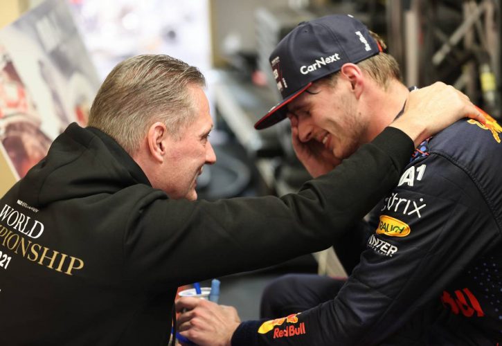 维斯塔潘在阿布扎比冲线拿到世界冠军,接受完初步采访之后,他与父亲在幕后享受了短暂的温馨父子时光,被记者用镜头记录了下来。