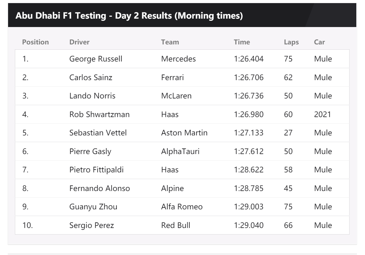 F1季后测试第二天继续进行,在已经结束的上午测试中,周冠宇仅比红牛的佩雷兹快,加入梅赛德斯的拉塞尔名列第一。