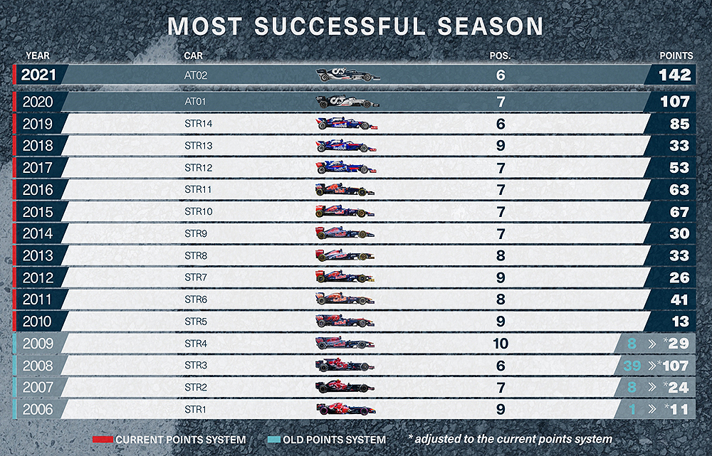 自更名Alpha Tauri之后,车队在过去两个赛季所参加的所有39站比赛使用的均是本田提供的动力单元,共计收获了249个积分,1个分站冠军,2个领奖台以及1次正赛最快单圈。