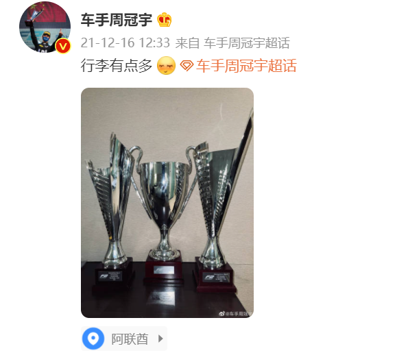 带着三个奖杯,周冠宇凡尔赛式抱怨:行李有点多