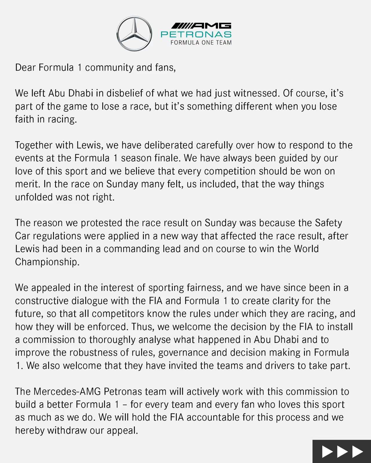 梅赛德斯车队将积极与该委员会合作,为每支车队、每一位像我们一样热爱这项运动的车迷,建立更好的F1。我们将要求FIA对这一过程负责,我们在此撤回我们的上诉。