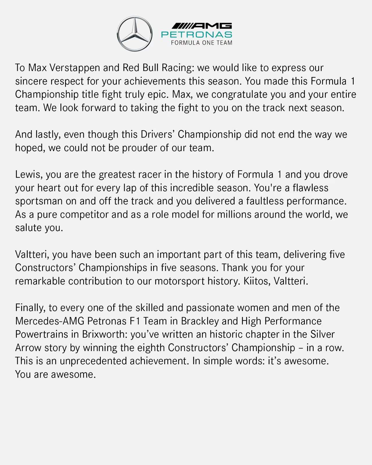 梅赛德斯-AMG Petronas F1车队声明: