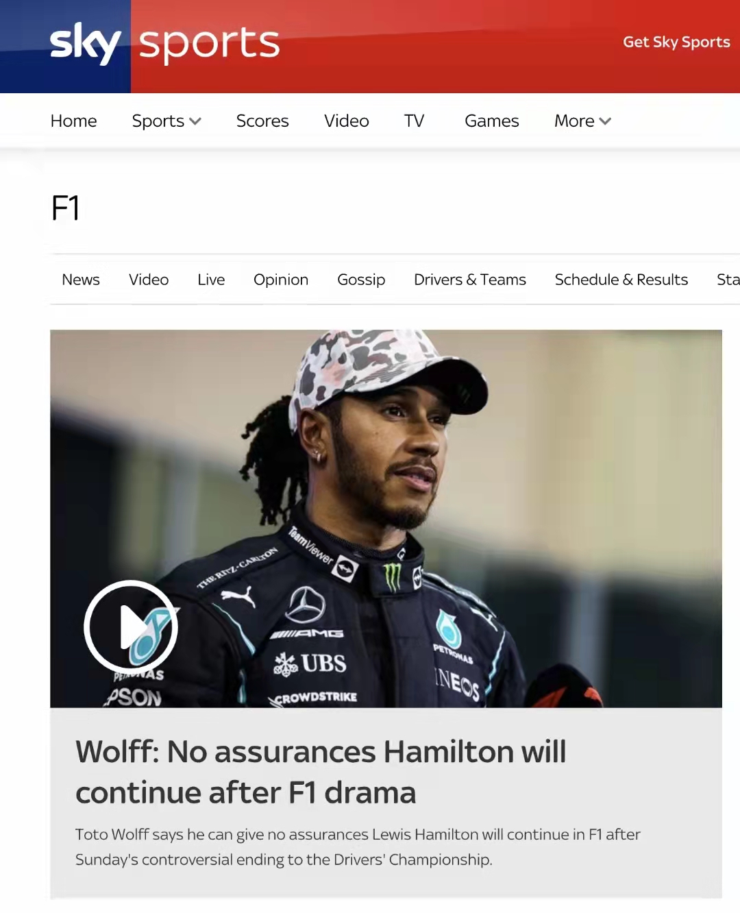 梅赛德斯领队托托·沃尔夫在接受媒体采访时表示,汉密尔顿有可能就此退役。