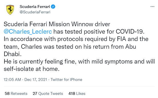 法拉利表示,勒克莱尔在从阿布扎比回程的路上确诊新冠,现出现轻微症状,将自我居家隔离。