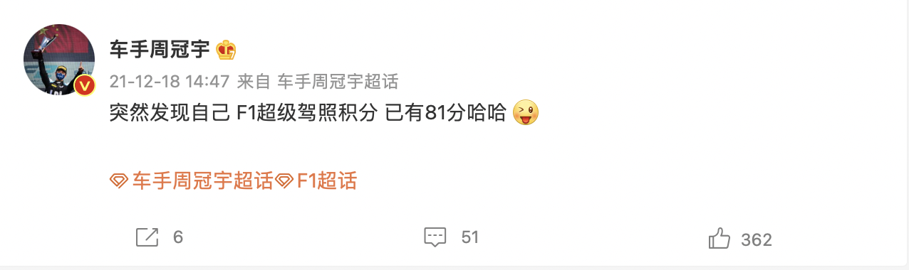 周冠宇在微博中称自己的超级驾照已累积81分,同时,他的偶像科比曾在一场比赛中取得过81分的惊人成绩。周冠宇以此来向自己的偶像致敬。