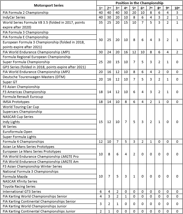 超级驾照是进入F1的通行证,超级驾照积分制在2015年启用,规定年轻车手必须通过多项比赛,如F2、F3等赛事,累积40分才能领取超级驾照。不同比赛和名次之间取得的分数也有差异。
