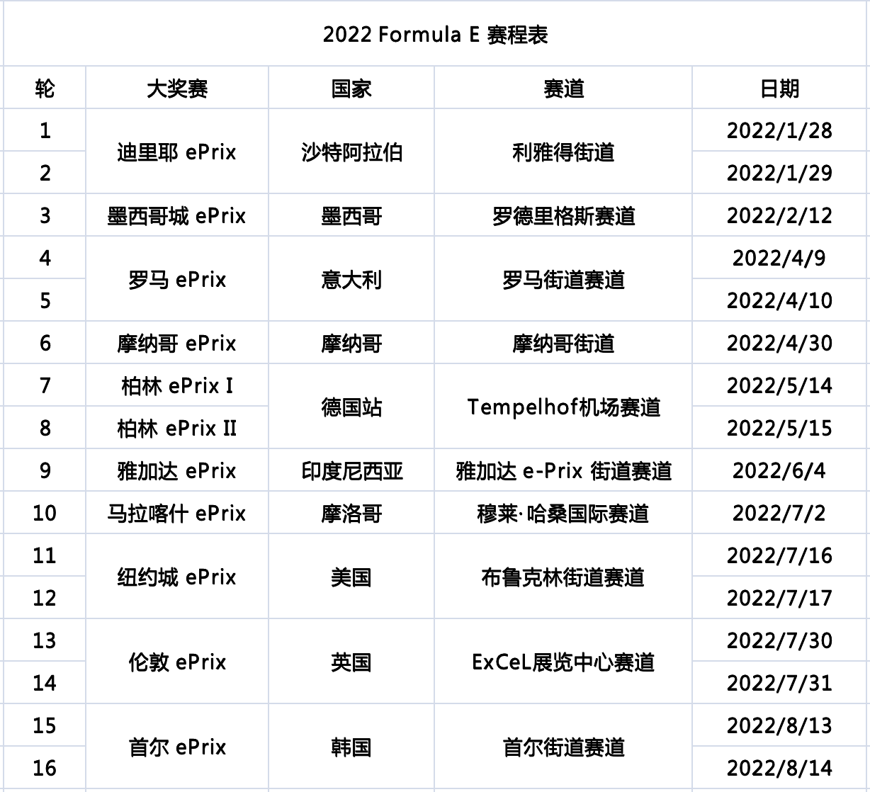 2022赛季FE电动方程式赛程表