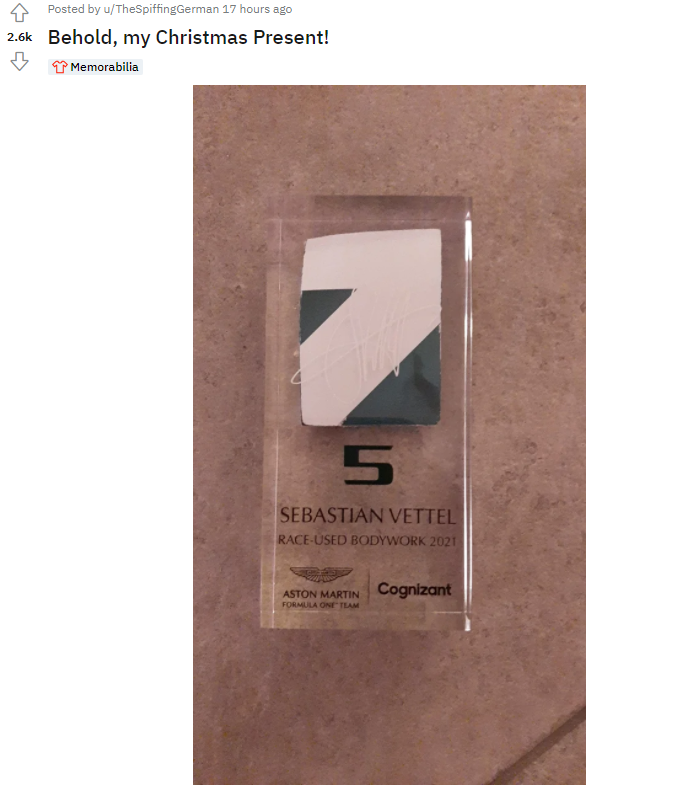 reddit网友晒出了可能是今年最牛的圣诞礼物!维特尔赛车上掉落的阿斯顿马丁赛车碎片,还有维特尔的亲笔签名!