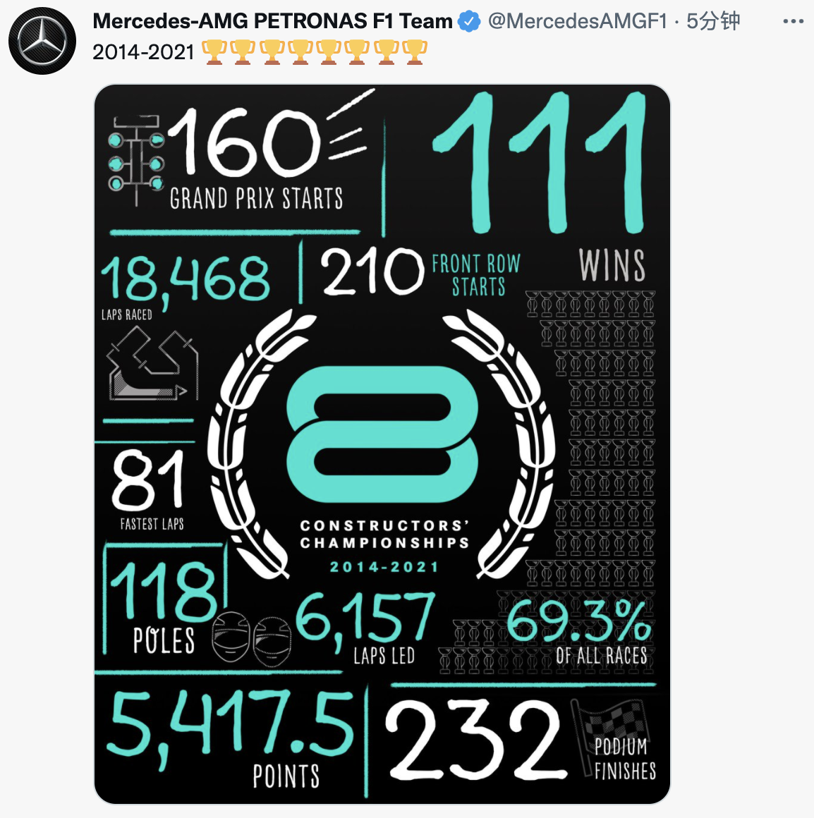 2014年至2021年间,梅赛德斯共获得: