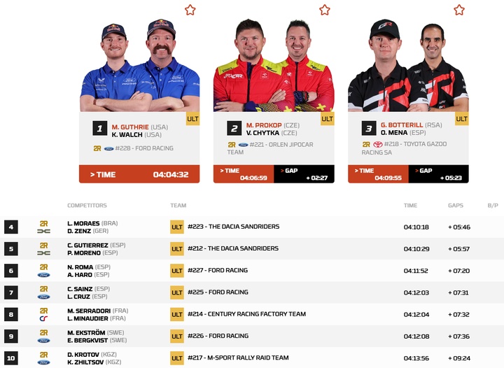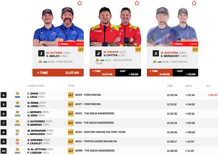 最终,福特车手格思里以4小时04分32秒的总用时赢下了第3赛段,他在今天的比赛里神奇般地没有遇到一次爆胎,这也是格思里在进入汽车最高T1组别后的首个赛段胜利!