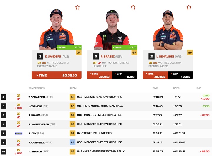 桑德斯在总成绩榜上领先布拉贝克2分钟,卢西亚诺·贝纳维德斯落后5分55秒排在第3。以下为第5赛段后,摩托车组总榜前十:
