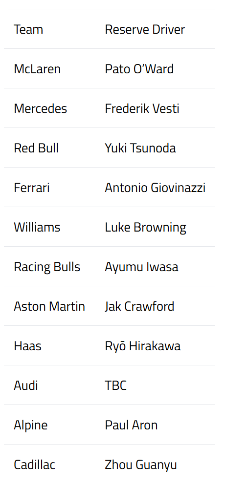 2026赛季F1各支车队储备车手阵容中,不仅有角田裕毅,还包括多位知名车手。前F1车手吉奥维纳兹,他曾在2019至2021赛季为阿尔法·罗密欧效力,如今已成为法拉利WEC项目的重要成员,2026年将继续担任法拉利储备车手。另一个熟悉的名字是周冠宇,在2022至2024赛季与博塔斯并肩作战三年,并于2025赛季担任法拉利储备车手后,他今年将在凯迪拉克车队担任相同角色。