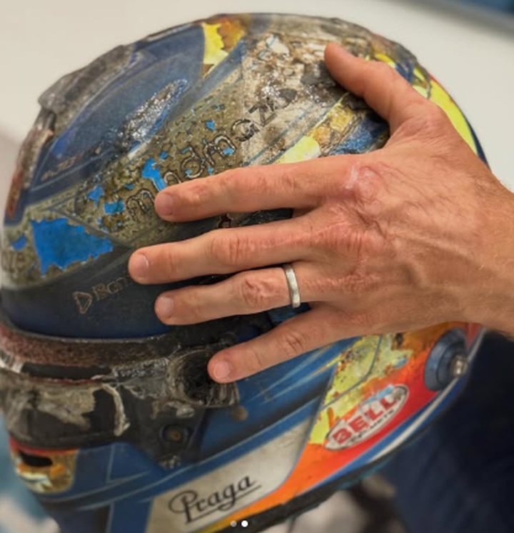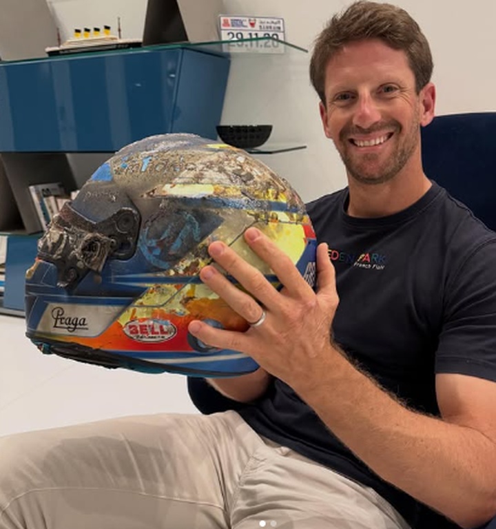 格罗斯让在社交媒体上分享了自己与那顶被烧毁的头盔重逢的画面——那正是他在巴林事故中佩戴的头盔。