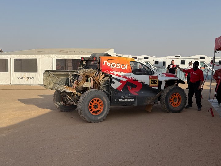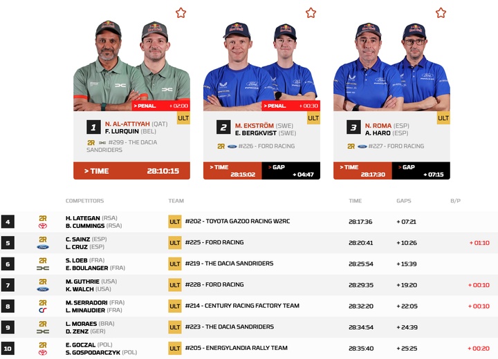 此前位列总榜第二的丰田车手拉特甘火力全开,在前417km几乎一直处在领先位置,却在最后40km的地方遇到了麻烦!拉特甘在经过一个坑洼路段时损坏了避震器,被迫停车更换并且尝试修复,直接损失了10分钟,从原本的赛段胜利掉到了赛段第13,原本的总榜领先也变成了第4。