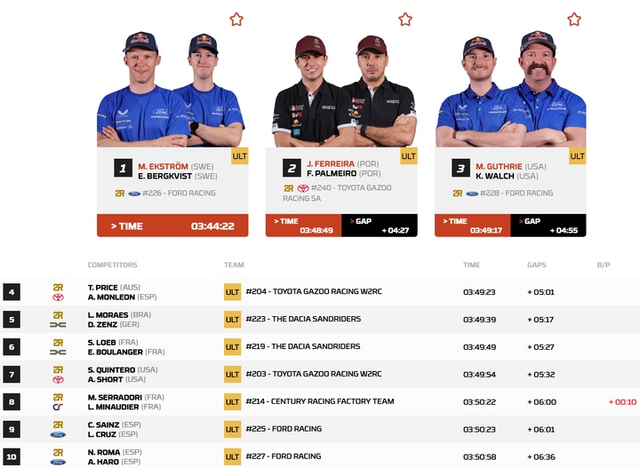 福特车手埃克斯特罗姆最终以3小时44分22秒的总用时成为第7赛段的冠军!格思里取得赛段季军,老塞恩斯和罗马分列九十。总成绩榜上,埃克斯特罗姆上升到了第2,落后阿尔阿提亚4分47秒,罗马和塞恩斯分列三五。