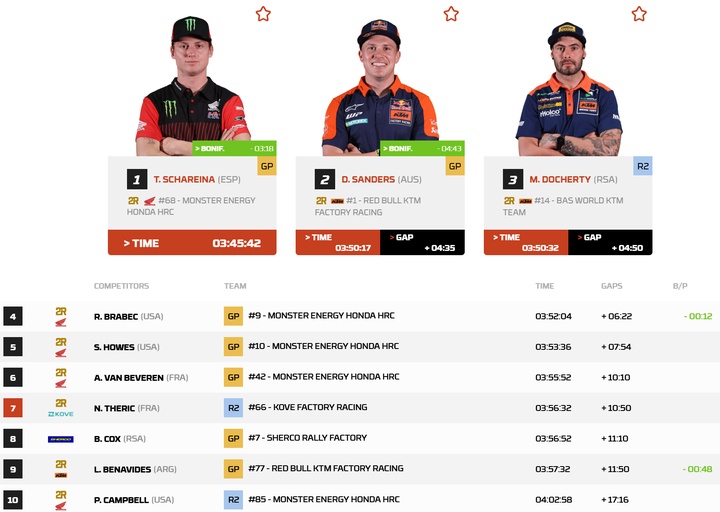 最终,在获得3分18秒的开路时间补偿后,本田车手沙雷纳以3小时45分42秒的总用时取得第9赛段胜利,KTM车手桑德斯落后4分35秒取得赛段亚军,而Rally2组别的多赫蒂落后4分50秒豪取赛段季军。