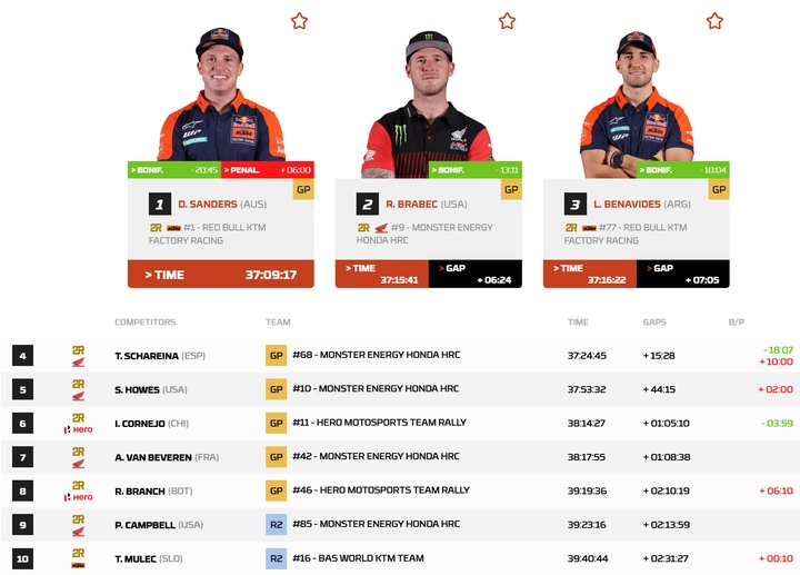 桑德斯目前领先布拉贝克6分24秒,这是今年达喀尔摩托车组总榜前二出现过的最大差距。以下为第9赛段结束后,摩托车组总成绩榜前十: