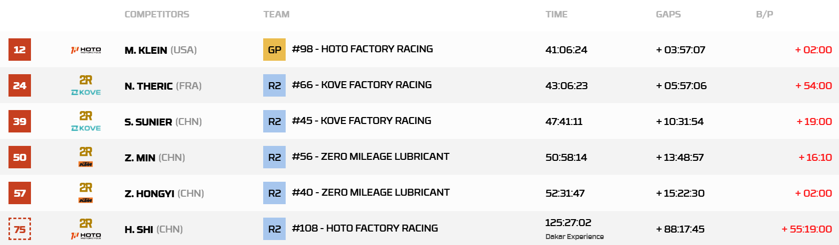 以下为第9赛段后,摩托车组中国军团总成绩榜排名: