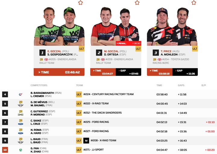 达西亚军团度过了不太顺利的一天,古铁雷兹落后14分49秒取得赛段第6,但争冠的两位车手都遇到了麻烦。阿尔阿提亚在273km被埃克斯特罗姆带偏,跟着迷路之后损失15分钟,最终落后26分23秒位列赛段第17。不过,虽然他丢掉了总榜领先的位置,但他只落后罗马1分10秒而已。