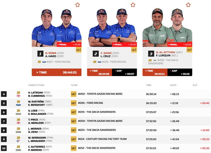 总榜前三现在只差1分10秒!对罗马和老塞恩斯来说,好消息是明天他们只需要从第7和第8发车,并不需要做太多开路工作。以下为第9赛段结束后,汽车组总榜前十: