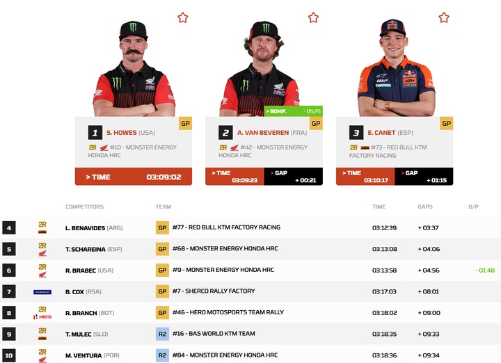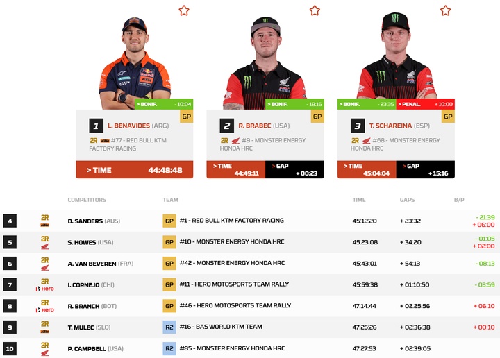 KTM车手卢西亚诺·贝纳维德斯落后3分37秒取得赛段第4,因为布拉贝克的策略战,贝纳维德斯上升到了总榜领先的位置,但是优势只有23秒而已,明天两位车手将展开决战!