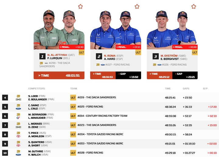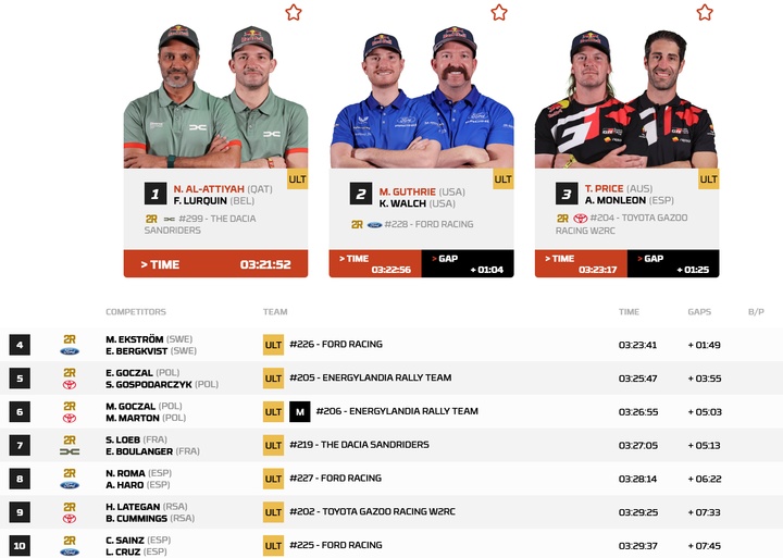 但是,没有人能够阻止阿尔阿提亚的势头,他最终以3小时21分52秒的总用时取得职业生涯第50个赛段冠军,追平达喀尔汽车组别最多赛段冠军的纪录,和瓦塔宁以及彼得汉塞尔并列第一!阿尔阿提亚只需要顺利完成收官日的赛段,就可以第6次成为达喀尔汽车组总冠军!