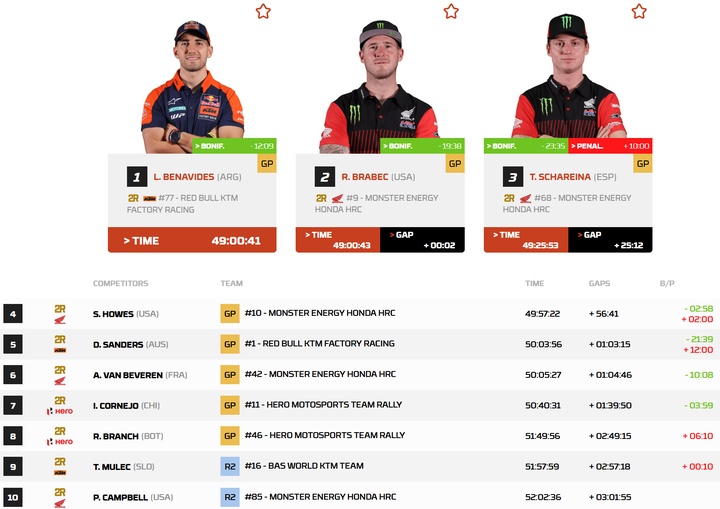以下为2026年达喀尔拉力赛摩托车组总成绩榜前十: