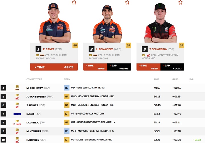 以下为摩托车组第13赛段成绩单前十: