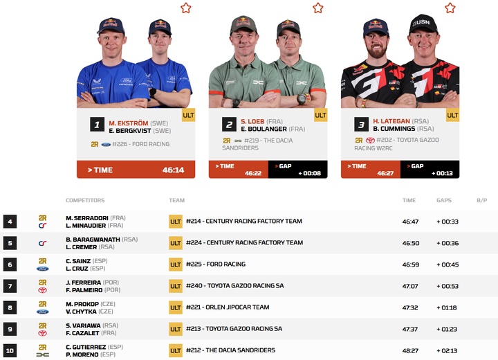 福特车手埃克斯特罗姆以46分14秒的总用时取得收官赛段冠军!他清楚自己今天必须要全力推进,因为另一位达西亚车手勒布在跟他争夺总榜前三。勒布落后8秒取得赛段亚军,最终以37秒的微弱劣势憾负埃克斯特罗姆,只能取得总榜第四。