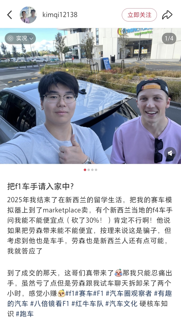 他在平台上表示:自己去年结束了在新西兰的留学生活,需要把自己的赛车模拟器放到某平台上出售。然后一位新西兰当地的F4车手询问能不能以7折的低价出售,起初留学生博主并不想答应。