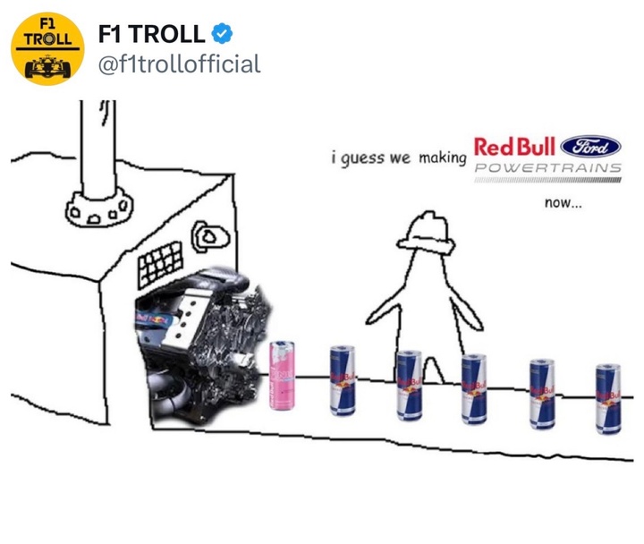 随着红牛-福特推进2026自主研发动力单元计划,一张“饮料流水线造引擎”的F1梗图近日在社交媒体流传。