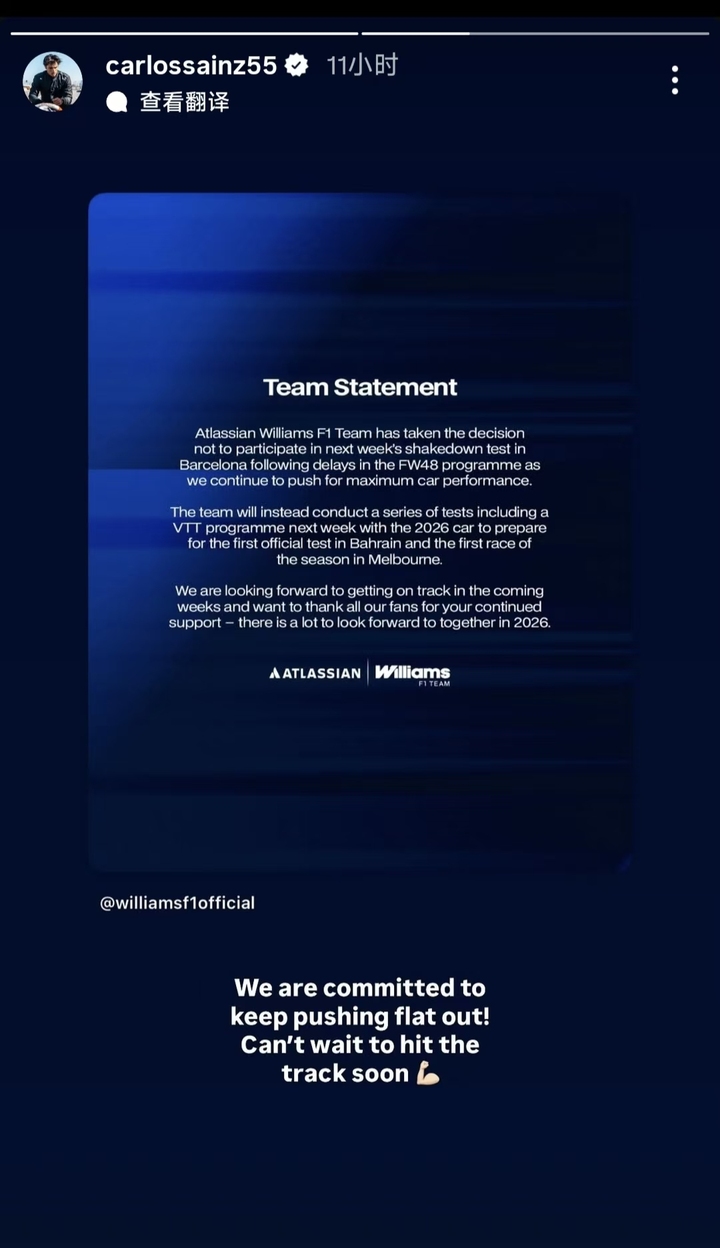 在车队官宣了不会参加即将到来的巴塞罗那封闭测试之后,威廉姆斯车手塞恩斯很快在社交媒体平台发声表达了自己对车队的支持。