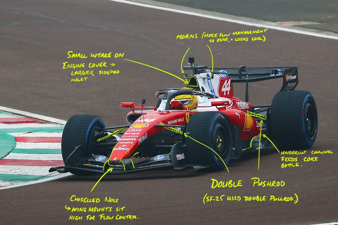 去年,法拉利感到自己的推杆设计已抵达性能曲线尽头,因此冒险将前悬挂改为拉杆布局。这形成了前后双拉杆的布置(尽管后悬挂连杆有所改动以提升尾部性能)。显然,法拉利认为在2026年规则下继续此举得不偿失,转而采用哈斯发布的2026年赛车所暗示的双推杆布局。