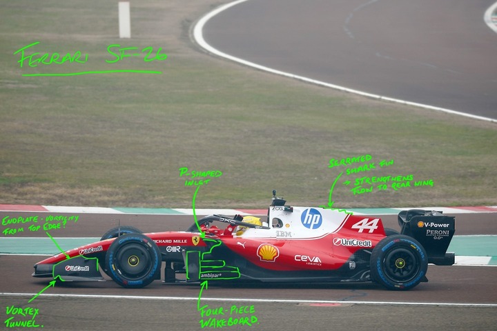这里有很多大胆的设计选择。或许其他车队选择暂时保留自己更激进的设计,但法拉利显然已经全力以赴,以求在这套规则实施的第一年取得成功。而且,为了法拉利自身,这些设计必须奏效并立即展现出竞争力,而这仅仅是开始。其他车队观察这些解决方案并在风洞中测试其效果并非难事,因此,创新绝不能枯竭。
